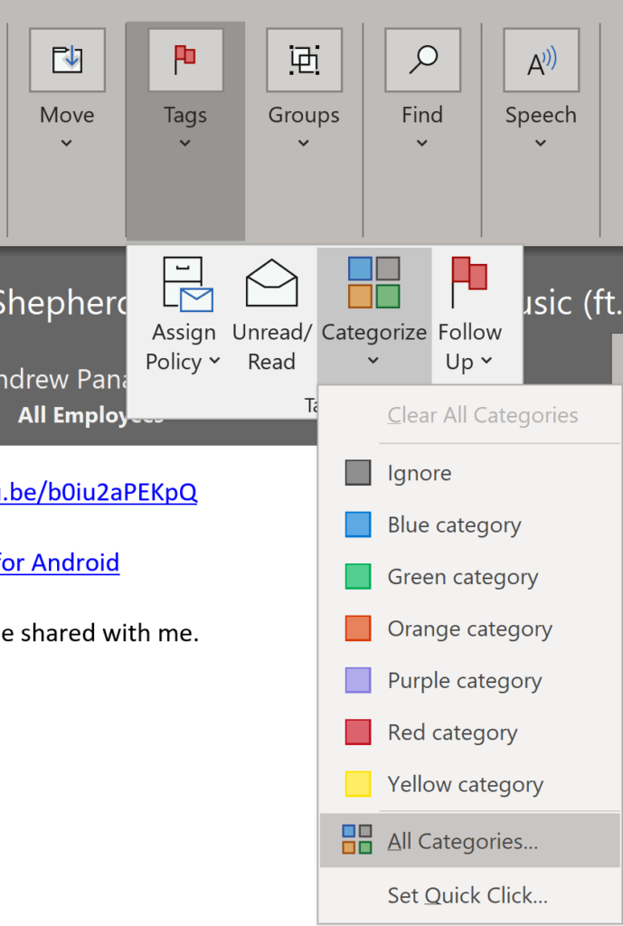 - In the “categorize” tab, you can select a color that is already created, or you can click “all categories…” and rename or create your own category.