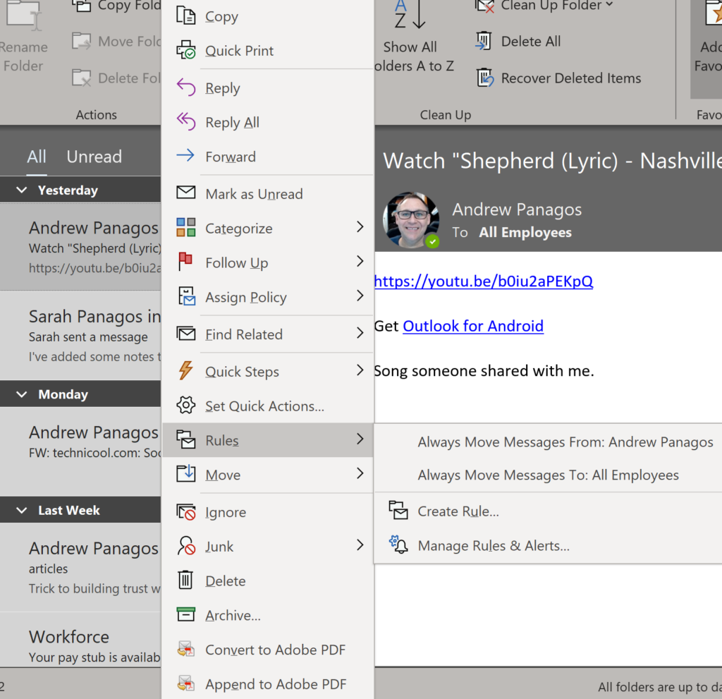 - Right click on an email from your inbox, and towards the middle of the menu will be a button “Rules”